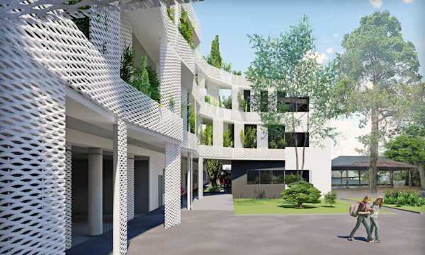 Vue à venir du bâtiment administratif et du bâtiment Jules Verne, en arrière plan.